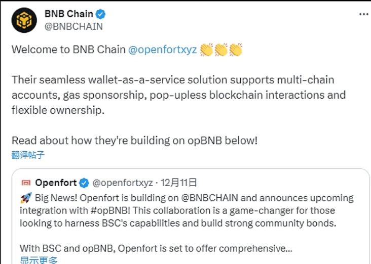 12月15日消息,据官方消息,Openfort正在基于BNB Chain构建,并宣布即将与opBNB集成。借助BSC和opBNB网络,Openfort将提供全面的用户账户抽象解决方案。