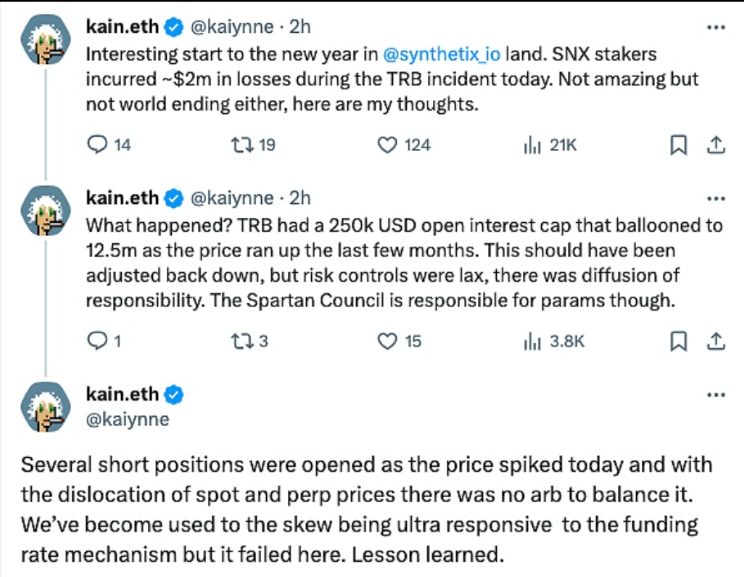 财经报道,Synthetix创始人kain.eth在社交媒体上表示,因今日的TRB异常波动事件,SNX质押者损失了约200万美元。kain.eth解释称,TRB在Synthetix原本存在上限25万美元的未平仓合约限制,但随着其价格在过去几个月的上涨,这一上限已膨胀至1250万美元,它本应被下调,但风险控制不严。随着今天TRB价格的飙升,几个空头仓位被开设,但由于现货价格和合约价格错位,套利平衡失灵,这对于Synthetix而言是一次教训。
