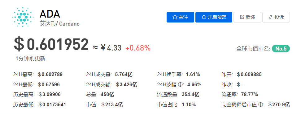ADA/艾达币今日价格**行情为$0.60040,24小时的交易量为$34175.8万。艾达币在过去24小时内增长了0.35%。目前市值排名为第5位,市值为212.808亿USD。流通总量为354.446亿ADA,发行量为450亿ADA。