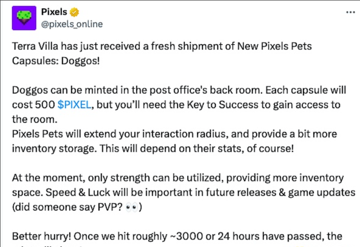 2月28日消息,链游Pixels宠物已开放铸造,面向此前游戏内已完成Key to Success任务的玩家,铸造费用为500 PIXEL。截止发稿,该NFT在Mavis Market上地板价报287 RON(约合858美元)。 据悉,此次宠物总量3000枚,开放窗口为24小时,Pixels宠物可提升游戏内玩家的活动范围,增加库存空间等,还将在未来的PVP模式中发挥效用。