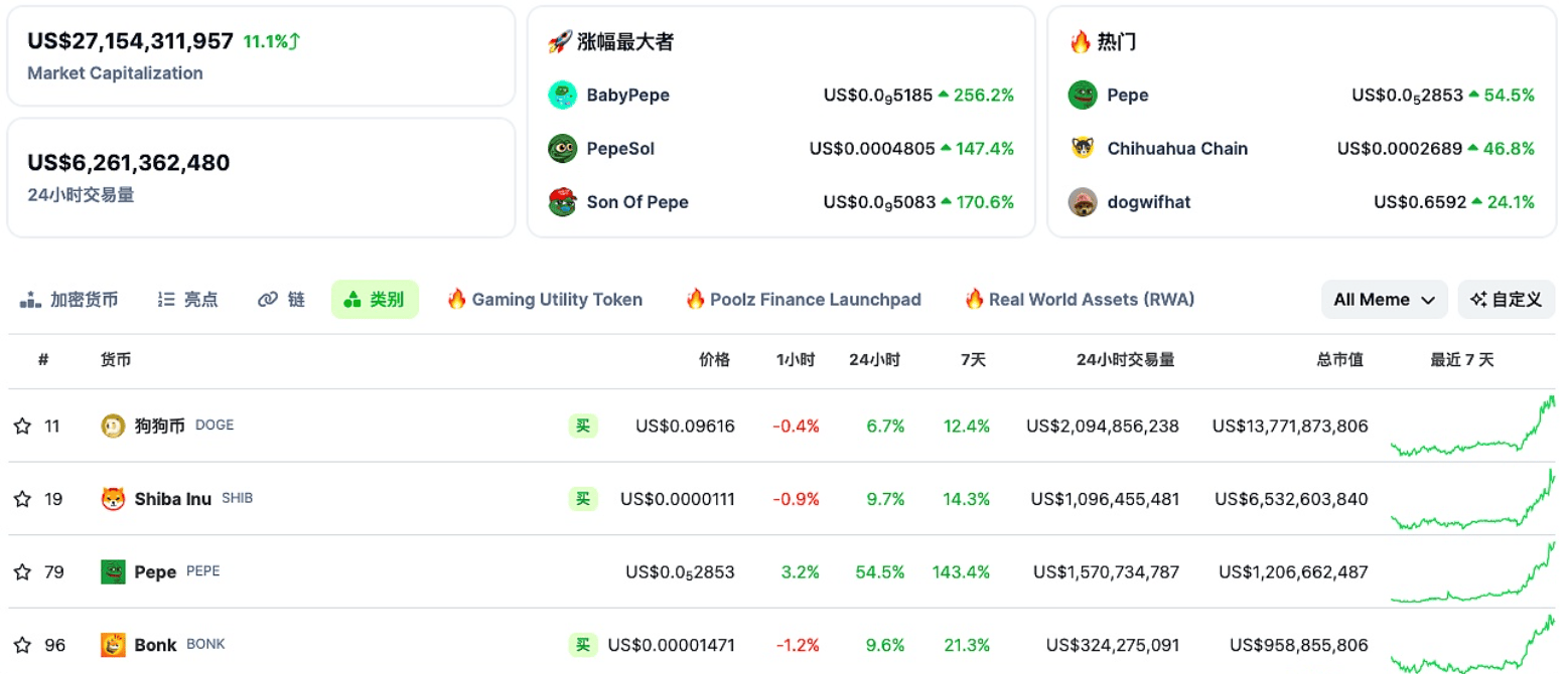 其中: DOGE过去24小时上涨6.8%,过去7天上涨12.4%; SHIB过去24小时上涨9.5%,过去7天上涨14.3%; PEPE过去24小时上涨54.5%,过去7天上涨143.4%; BONK过去24小时上涨8.7%,过去7天上涨21.3%; FLOKI 过去24小时上涨26.3%,过去7天上涨56.3%.