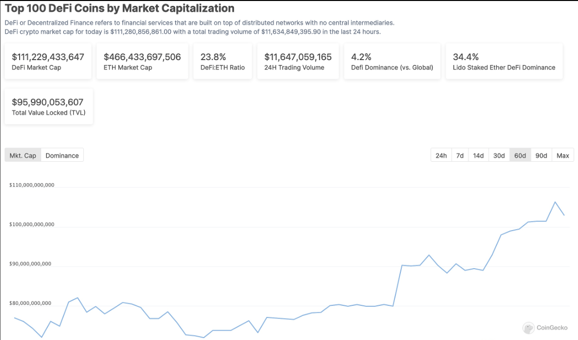 3月6日财经报道,数据显示,DeFi板块市值突破1100亿美元,目前为111,229,433,647美元,ETH市值为466,433,697,506美元,DeFi:ETH比率为23.8%,DeFi TVL为95,990,053,607美元,DeFi代币24小时交易额为11,647,059,165美元。