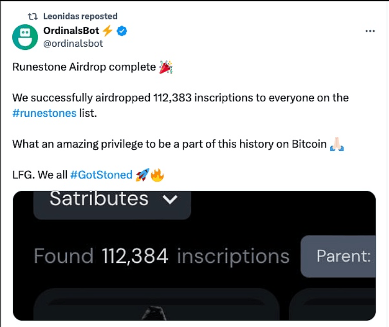 3月16日财经报道,据Magic Eden数据显示,Runestone已完成全部112,383枚空投,当前地板价暂报0.0218 BTC,累计交易量超206.6358 BTC,持币地址数量接近9.8万个。 Runestone由早期Ordinals玩家Leonidas发起,是一个开源、透明、自发和去中心化的倡议,旨在奖励那些参与了Ordinals协议第一年的玩家。所有符合规则的地址都将在24小时内收到空投,具体参考的快照是在区块高度826,600之前的活动。