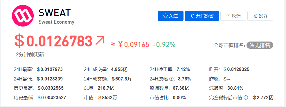 SWEAT币今日价格为$0.012651,其24小时的交易量为$608.219万。SWEAT币在过去24小时内下跌了0.9%,市值为8523.57万USD,流通总量为673762万SWEAT,发行量为218.673亿SWEAT。