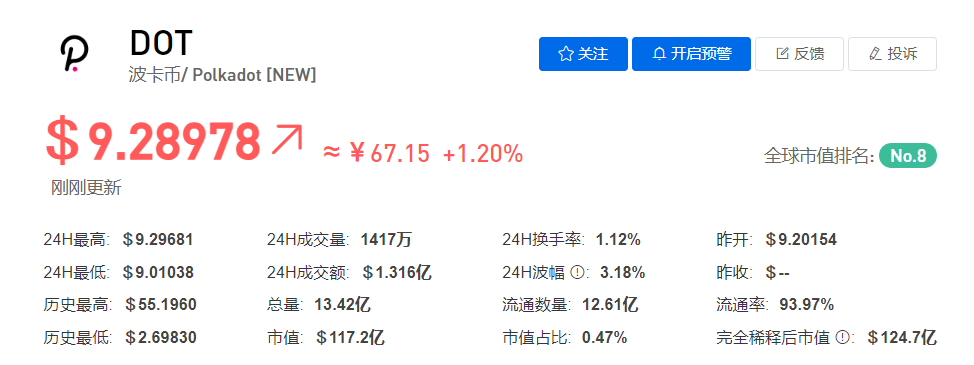 波卡币今日价格为$9.29,其24小时的交易量为$13168.3万。波卡币在过去24小时内增长了1.2%。目前市值排名为第8位,其市值为117.180亿USD,流通总量为126134万DOT,发行量为134227万DOT。