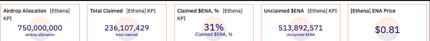 4月3日消息,据Dune数据显示,ENA代币已申领数量为236,107,429枚,占空投总量约31%;未申领数量为513,892,571枚。已申领代币的独立钱包数量达到21,977个。
