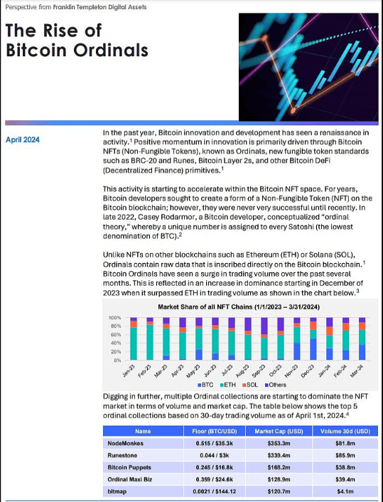 4月4日财经报道,富兰克林邓普顿数字资产部门今天在新的招股说明书中重点介绍了Ordinal铭文的崛起。富兰克林邓普顿数字资产公司写道,在过去的一年里,比特币的创新和发展活动出现了复兴。创新的积极势头主要是通过比特币 NFT(Ordinals)、新的可替代代币(例如BRC-20和Runes)、比特币Layer 2以及其他比特币DeFi来推动的。