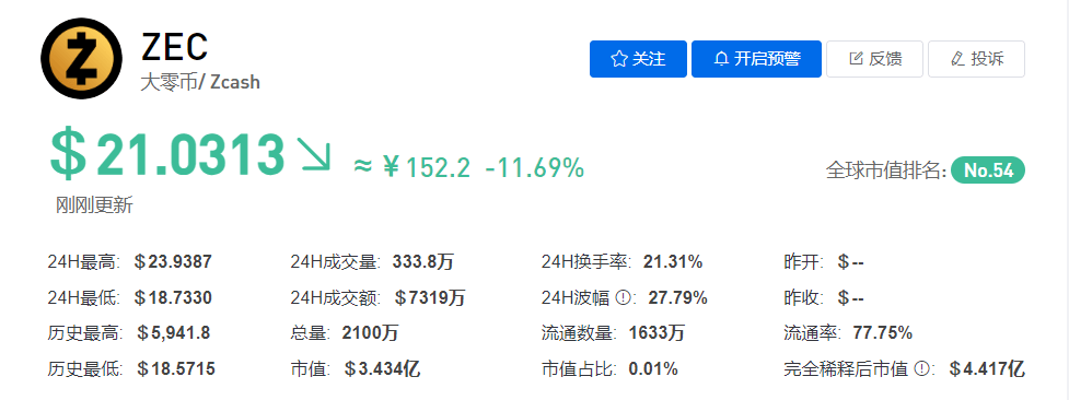 大零币今日价格为$21.03,其24小时的交易量为$7316.23万。大零币在过去24小时内下跌了11.64%。目前在市值排名为第54位,其市值为34343.0万USD。其流通总量为1632.82万ZEC,其发行量为2100万ZEC。