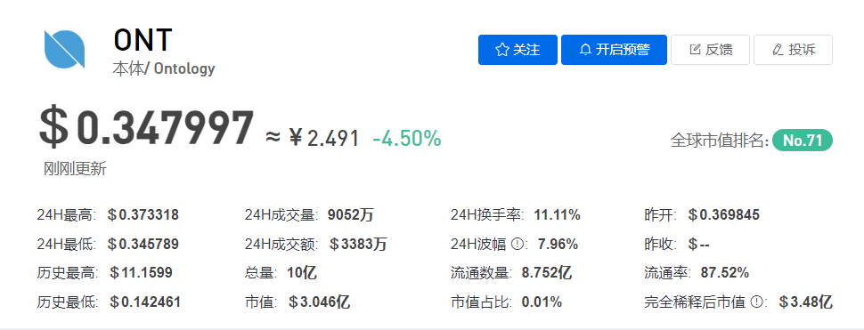 本体币今日价格为$0.34807,其24小时的交易量为$3381.64万。本体在过去24小时内下跌了4.49%。目前市值排名为第71位,其市值为30464.9万USD。其流通总量为87524.9万ONT,其发行量为100000万ONT。