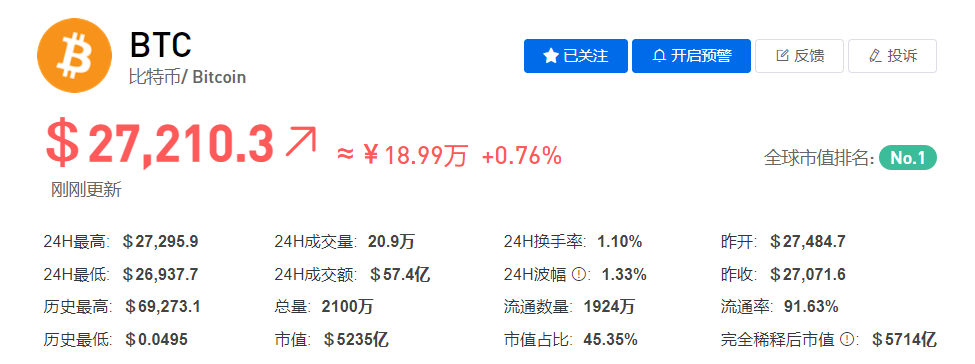 比特币今日价格为$27210.3,24小时的交易量为$578502万。比特币在过去24小时内增长了0.53%。目前市值排名为第1位,为5235.66亿USD。流通总量为1924.20万BTC,发行量为2100万BTC。