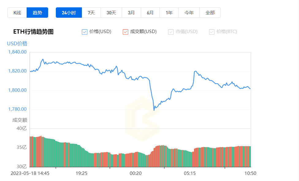 以太坊**价格为$1808.35,24小时的交易量为$351013万。以太坊在过去24小时内下跌了0.66%。目前市值排名为第2位,市值为2179.48亿USD。流通总量为12052.3万ETH,发行量为12052.3万ETH。