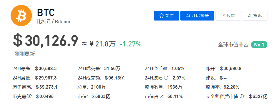 比特现在价格为$30126.97,其24小时的交易量为$961789万。比特币在过去24小时内下跌了1.27%。市值排名为第1位,其市值为5833.17亿USD,流通总量为1936.19万BTC,发行量为2100万BTC。