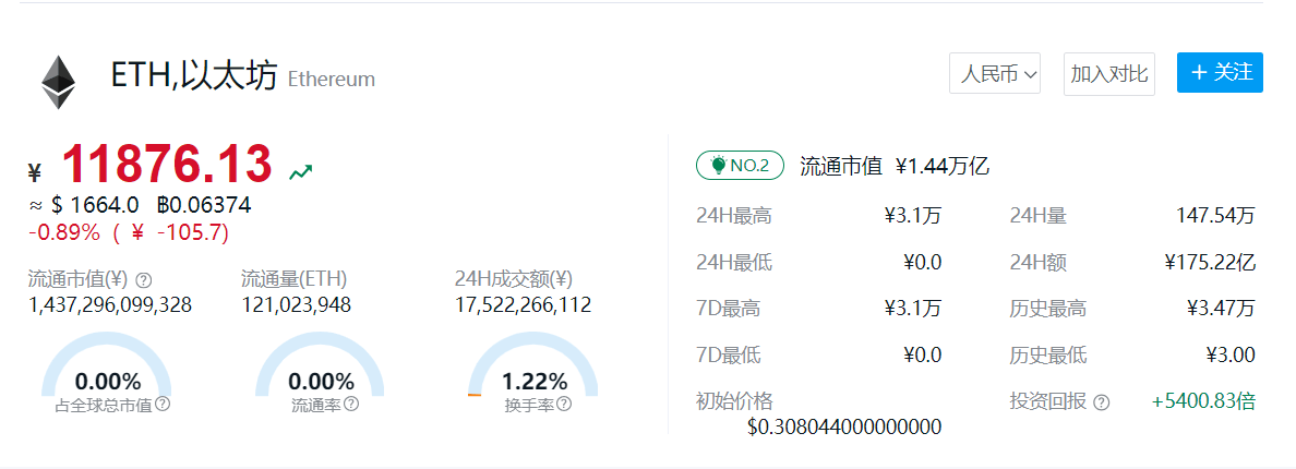 今日以太坊的价格为¥11876.13元。