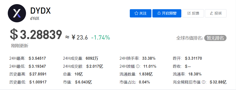 DYDX币今日价格行情为$3.288,24小时成交额为$2.017亿,24小时**价格为$3.545,历史**价格为$27.859。
