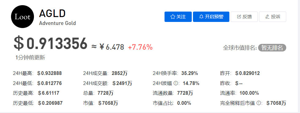 AGLD今日价格为$0.9133,24小时的交易量为$2493.44万,AGLD在过去24小时内增长了7.29%,历史**i价格为$6.611,***格为$0.2069。